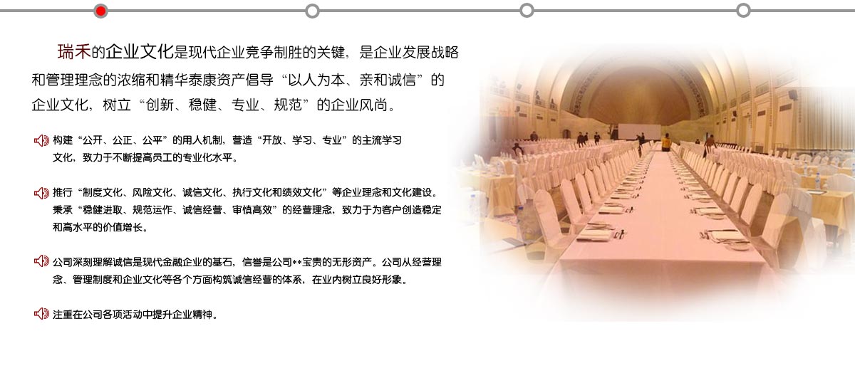 成都瑞禾文化传播有限公司是成立于2011年,位于成都市双流县黄水镇红桥7组122号,公司固定员工15人,占地面积约200平方米(含库房)。是集专业篷房搭建,桌椅租赁,广告策划,开业庆典,会议活动,展览展示活动用品租赁为一体的租赁公司。锲而不舍的开拓精神,独树一帜的创新设计,精益求精的建造施工。自成立以来,所服务的业务范围已经逐步延伸至各行各业。我们依靠强大综合的执行力、精湛的制作工艺、合理的价格,成功服务了数家国内外知名企业。 公司有着多年的行业经验,以强大的制作租赁优势为依托,不断的完善制作技术和引进先进的设备,目前已发展成为西南地区技术全面、设备精良、经验丰富、用品齐全的专业展览会议广告制作租赁公司。 我们在成功满足客户不同需求的同时,也在不断地积累和充实我们的会务资源及服务设施,长期的资源积累和服务提炼使我们在行业服务上变得更专业、更完善。
